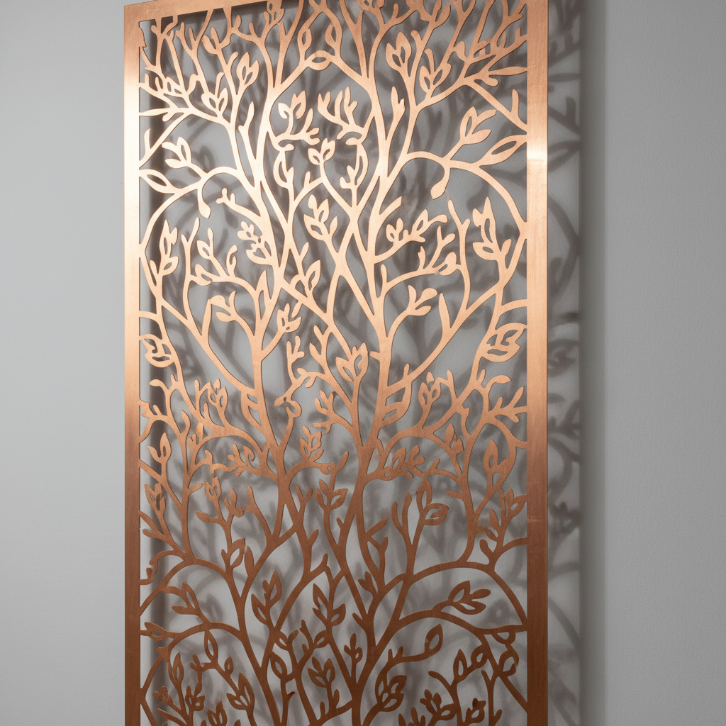 Custom decorative copper panel with intricate laser-cut pattern for high-end architectural installation.