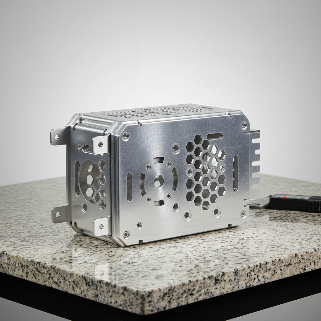 Complex electronics enclosure with intricate cutouts and precise bends for telecommunications equipment.